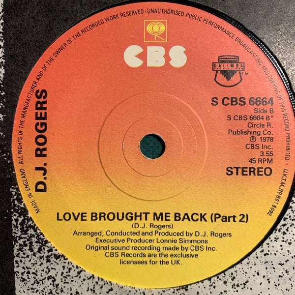 Vinyl, 45 RPM1, 7", Love Brought Me Back, D. J. Rogers, 1978, UK