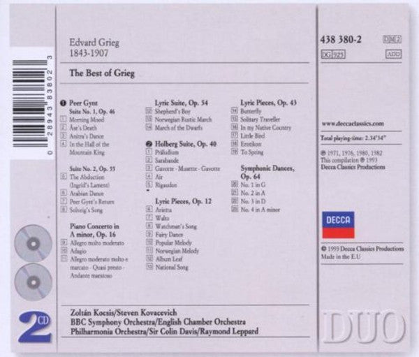 Grieg* - Zoltán Kocsis, Stephen Kovacevich*, BBC Symphony Orchestra, English Chamber Orchestra, Philharmonia Orchestra, Sir Colin Davis, Raymond Leppard - The Best Of Grieg . Including The Piano Concerto In A Minor - 2xCD - Europe