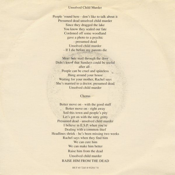 Track A1 recorded at Abbey Road. Tracks A2 to B2 recorded and mixed at RAK Comes with a lyric sheet for 'Unsolved Child Murder'. © 1995 VC Records Ltd. t/a Hut Recordings. ℗ & © 1995 VC Records Ltd. t/a Hut Recordings. Printed in the U.K. Polygram Music Publishing.